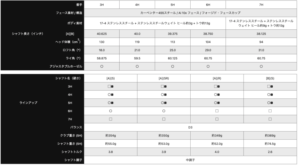 ロフト設定(代表)3H:19°/4H:22°/5H:24°程度3H:18°/4H:21°/5H:25°程度3H:23°/4H:27°/5H:31°程度