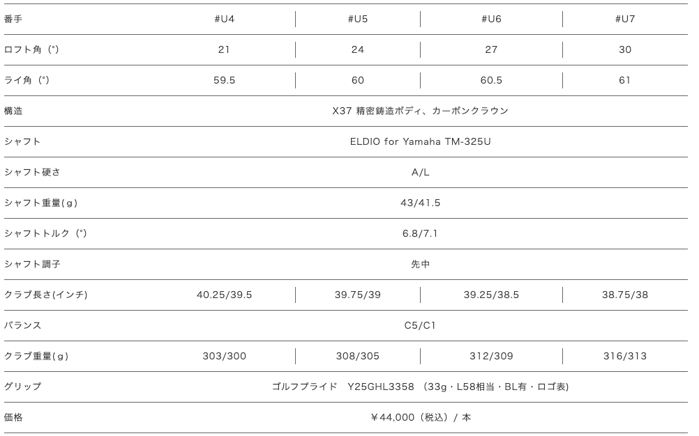 このモデルは、女性ゴルファーのために「振り抜きやすさ」「高初速」「高弾道」をテーマに設計されたユーティリティです。高強度素材「X37」を採用し、カーボンクラウン構造によって余剰重量を重心設計に活用、低・深重心化を実現しています。ために打ち出しが高く出やすく、ボールが上がりにくい場面でも安心感があります。