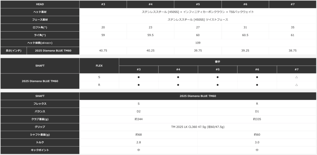 | ヘッド体積・仕様概略 | 約106 cc/3番ロフト19°等 | 約109 cc/3番ロフト20°等 | 約109 cc/4番ロフト23°など軽量設計 |